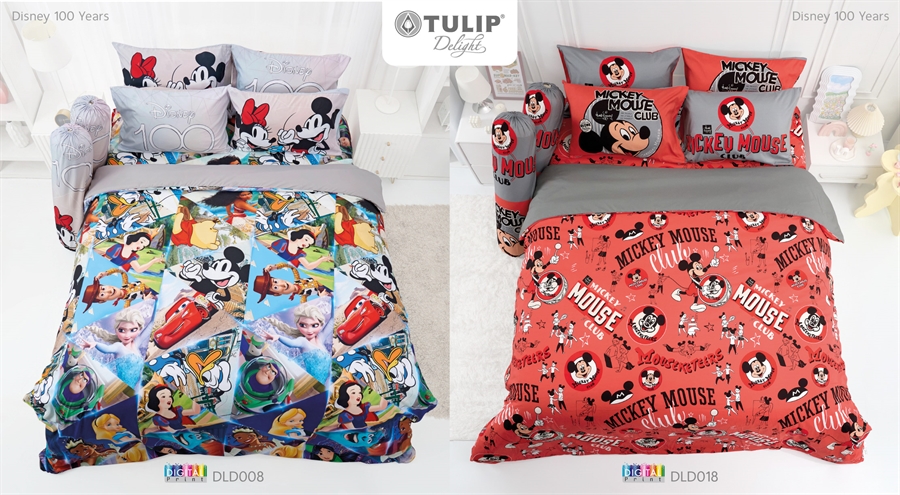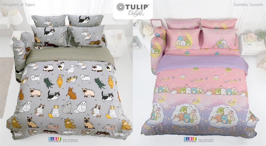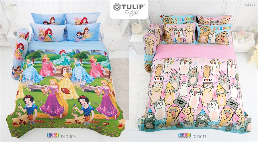 ชุดเครื่องนอนทิวลิป ที่พิมพ์ด้วยระบบดิจิตอลปริ้นท์ ลวดลายมีมิติเล่นโทนสีได้อย่างสวยงาม ผลิตจากเนื้อผ้าไมโครพลัสให้สัมผัสนุ่มนวล ทอด้วยเส้นด้าย 340 เส้นด้าย/10 ตร.ซม. สามารถรัดมุมที่นอนได้สูงสุด 13 นิ้ว และมีให้เลือกมากถึง 39 ลาย เช่น ลายการ์ตูน Princess มีให้เลือกทั้งโทนชมพูหวาน โทนสีฟ้า หรือโทนชมพูเหลือง แล้วก็ยังมีลาย Toy Story, ลายการ์ตูน หมาจ๋า, ลายการ์ตูน Sumikko, ลายการ์ตูน Disney 100 Years, ลายทูนหัวของบ่าว, ลาย Spider-Man เป็นต้น