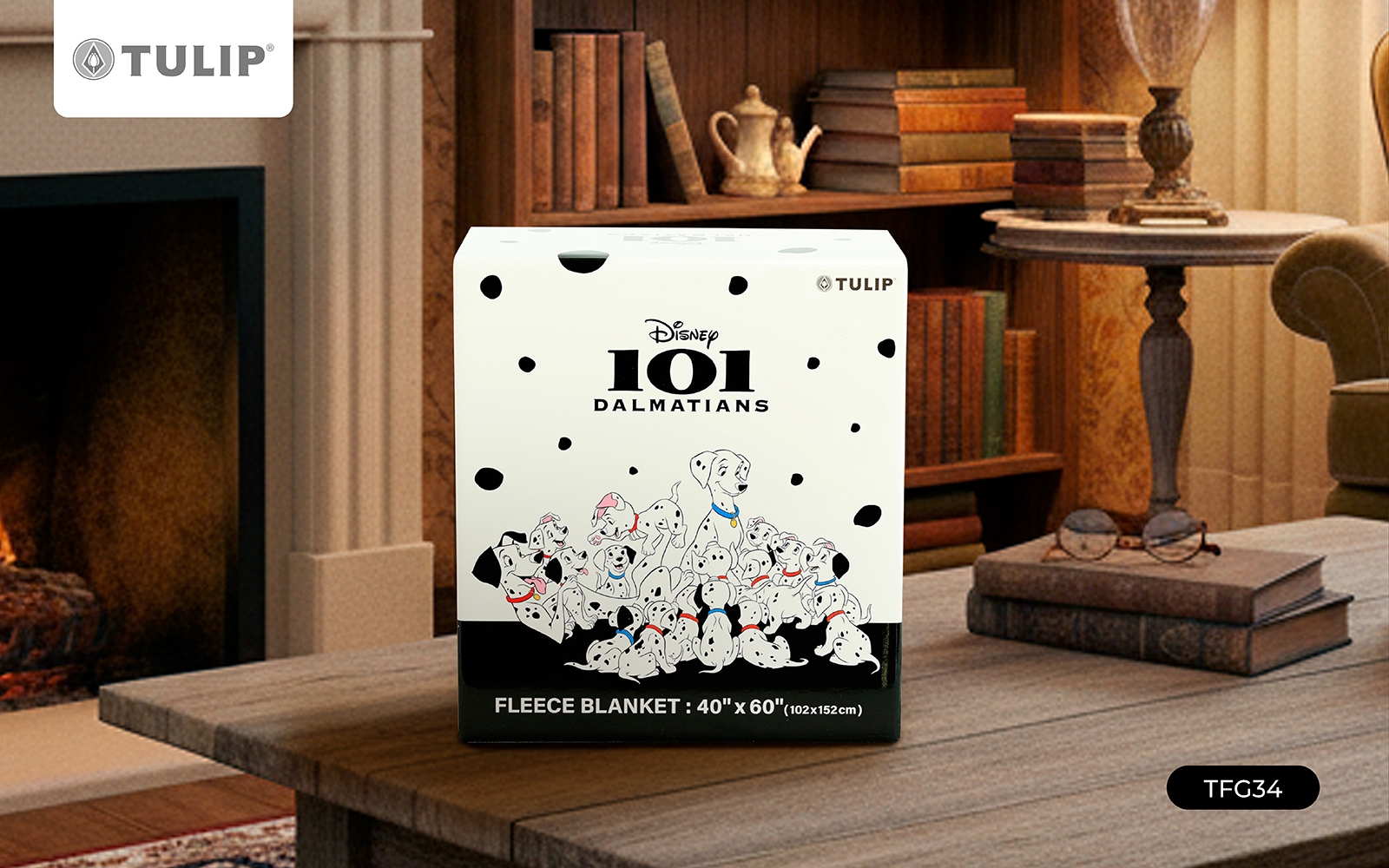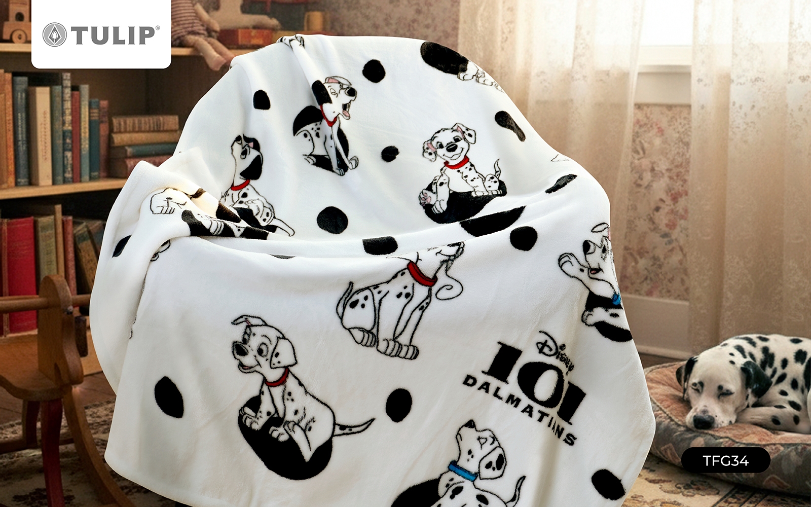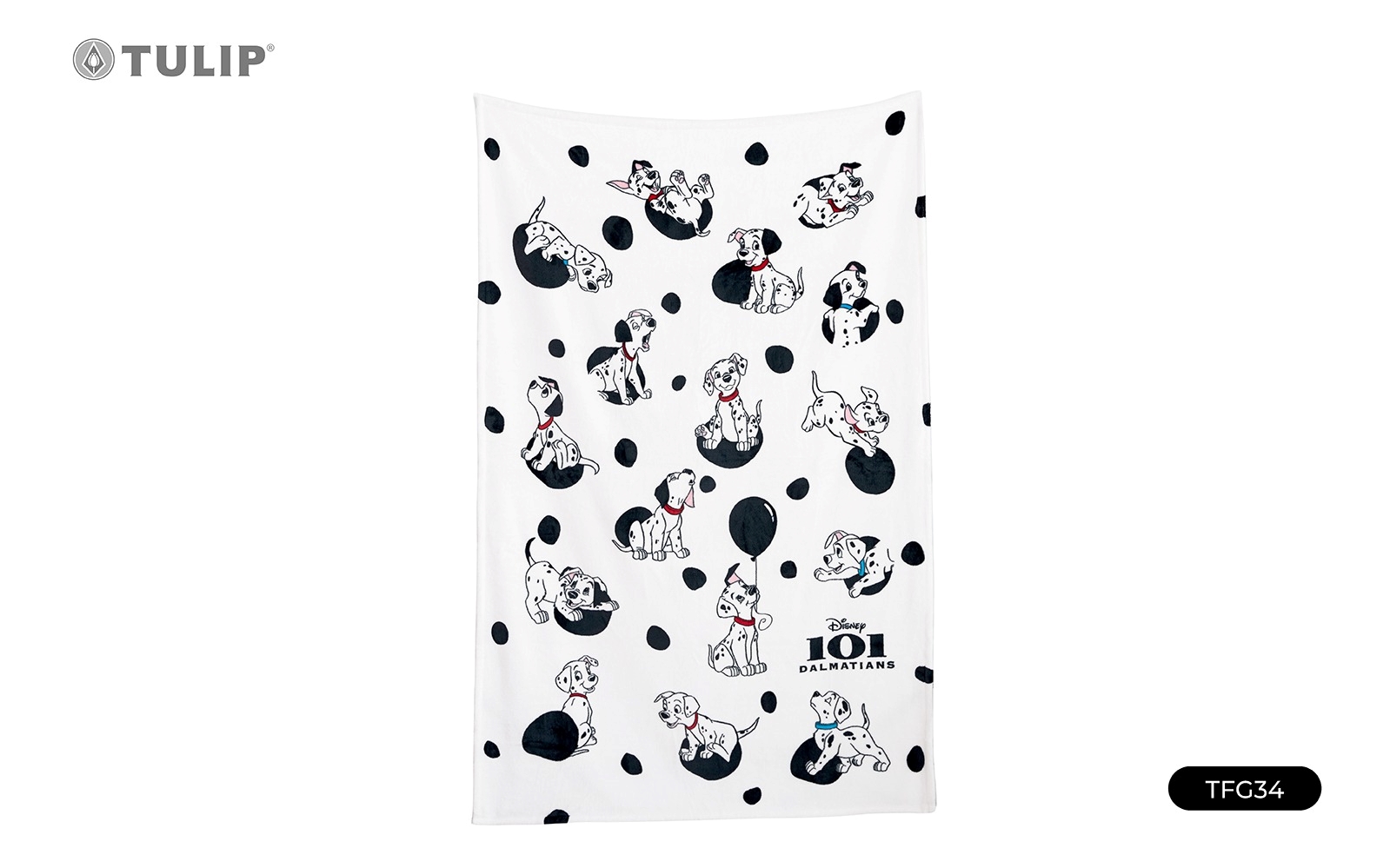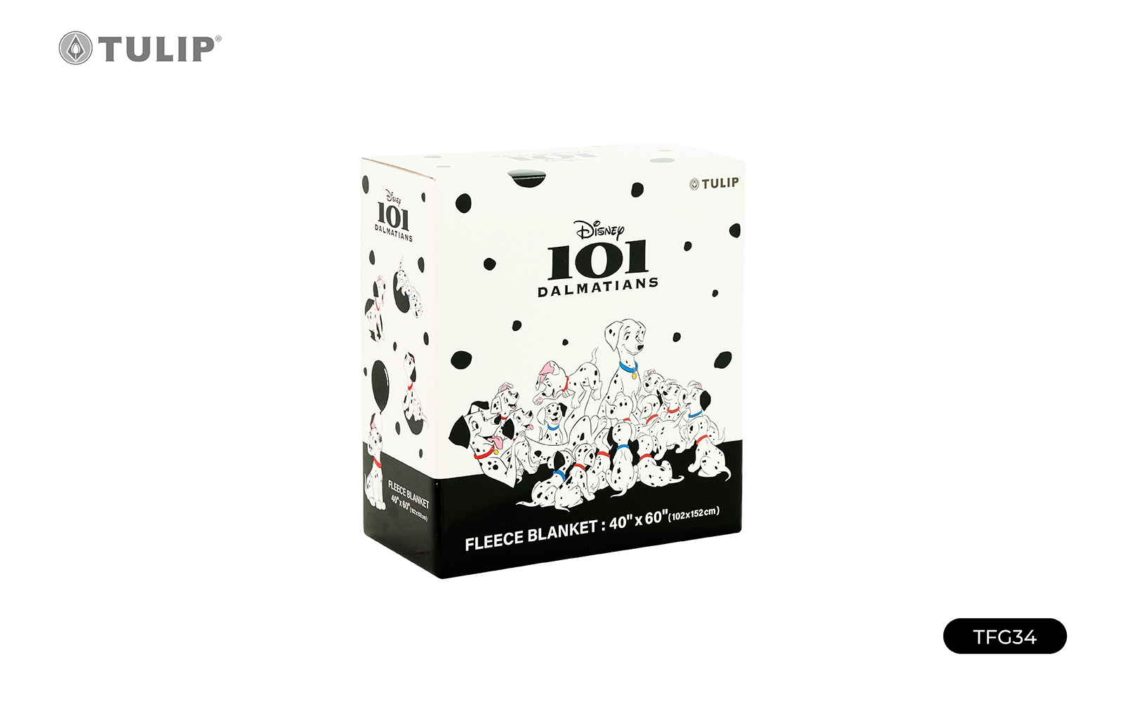 พิมพ์ลาย "101Dalmatians" 101 ดัลเมเชียน เอาใจคนรักน้องหมาสุดๆ ด้วยโทนสีขาว-ดำ (Black & White) ที่เป็นสีหลักของตัวละคร ทำให้ภาพรวมดูคลาสสิก สง่างาม และเป็นอมตะตามแบบฉบับ Disney มาในรูปแบบผ้าห่มขนแกะเทียม ขนาดกะทัดรัด พกพาง่ายด้วย