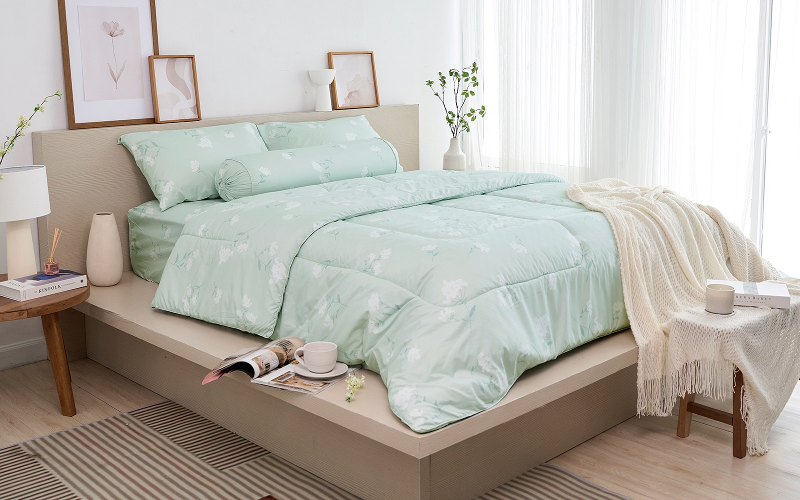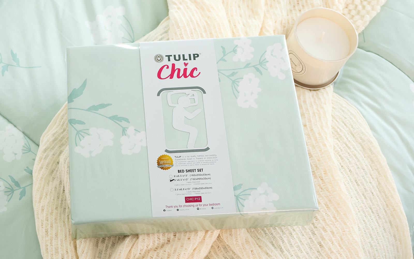 TULIP CHIC รุ่น CHIC P12 พิมพ์ลายสวีท วูดดรัฟ (Sweet Woodruff )เป็นดอกไม้ป่าสีขาวขนาดเล็ก เรียบง่ายและเป็นธรรมชาติ โทนสีเขียวอ่อนให้ความรู้สึกสบายตา ผ่อนคลาย น่ารักแต่ไม่หวานจนเกินไป ลายนี้เหมาะสำหรับผู้หญิงที่มีสไตล์เรียบง่าย น่ารัก และชื่นชอบความคลีนแบบมูจิ เพิ่มความอบอุ่นอ่อนโยนให้กับห้องนอนอย่างลงตัว