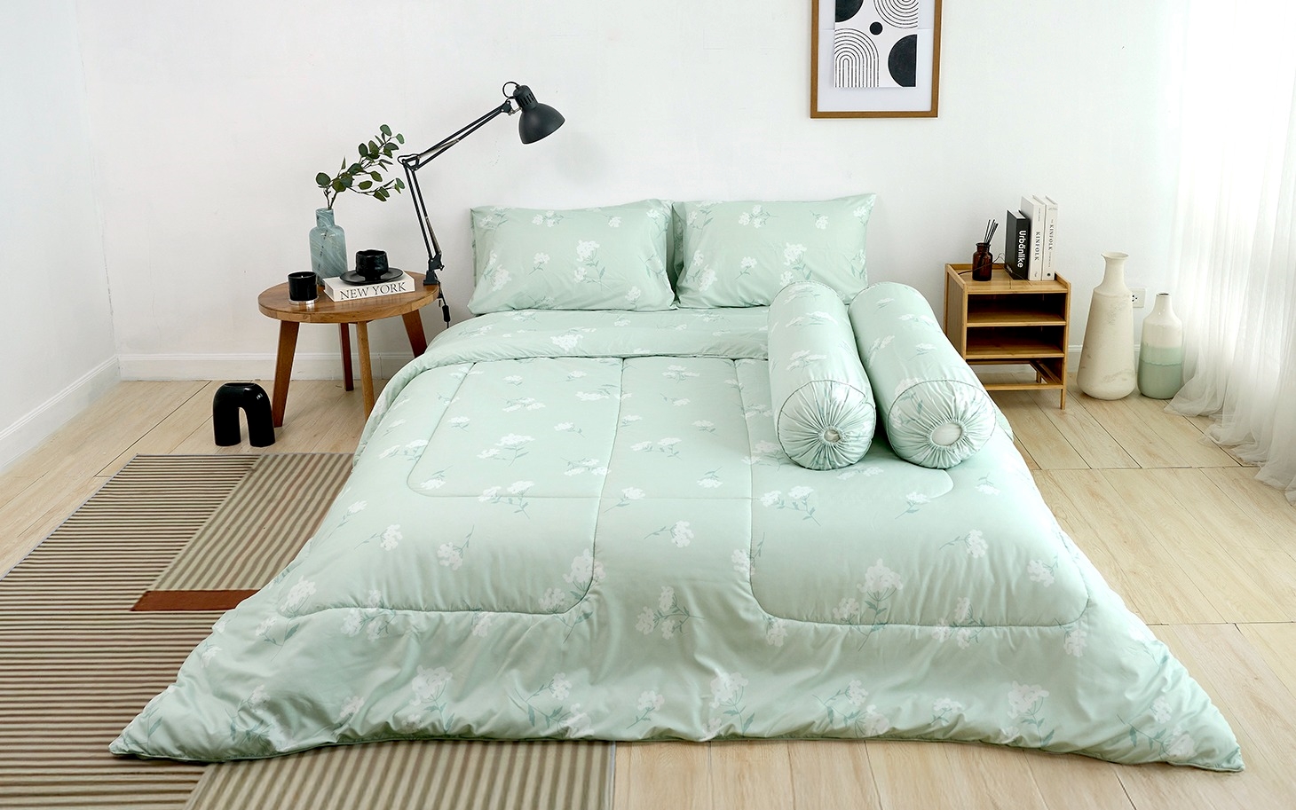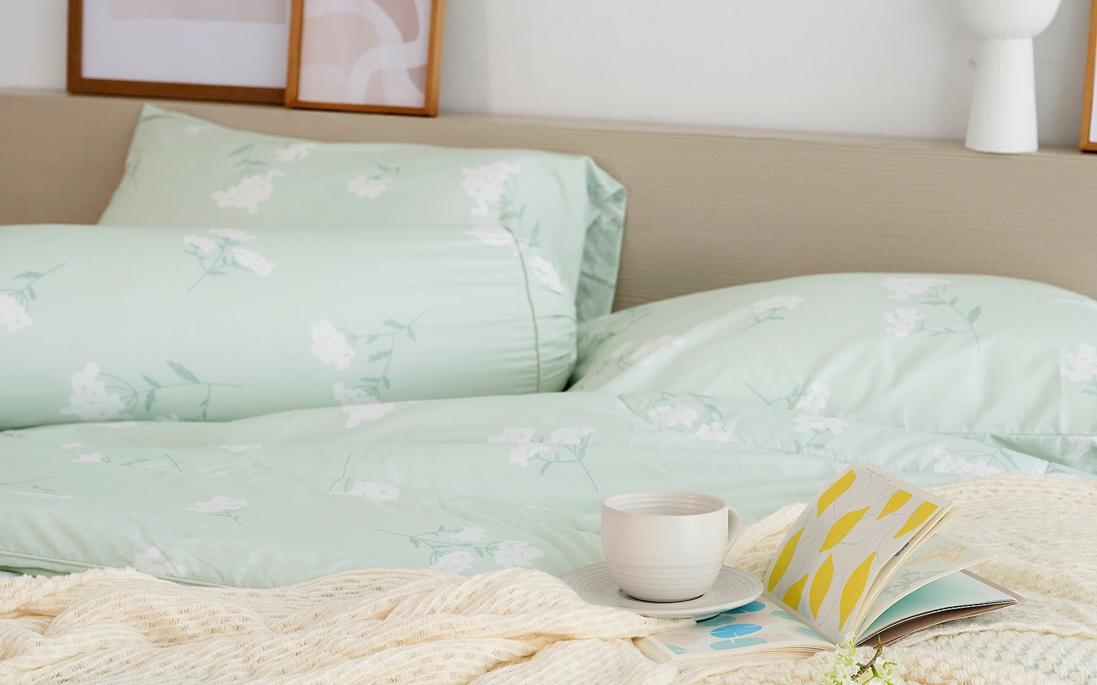 • ชุดเครื่องนอนทิวลิปชิค พิมพ์ลายดอกไม้ป่าสีขาวขนาดเล็ก โทนสีเขียว มินิมอล